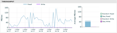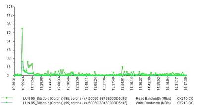 This shows that we’re asking a lot more from the new array. Previously we were spiking at 10MB/sec, now spiking at 120MB/sec.